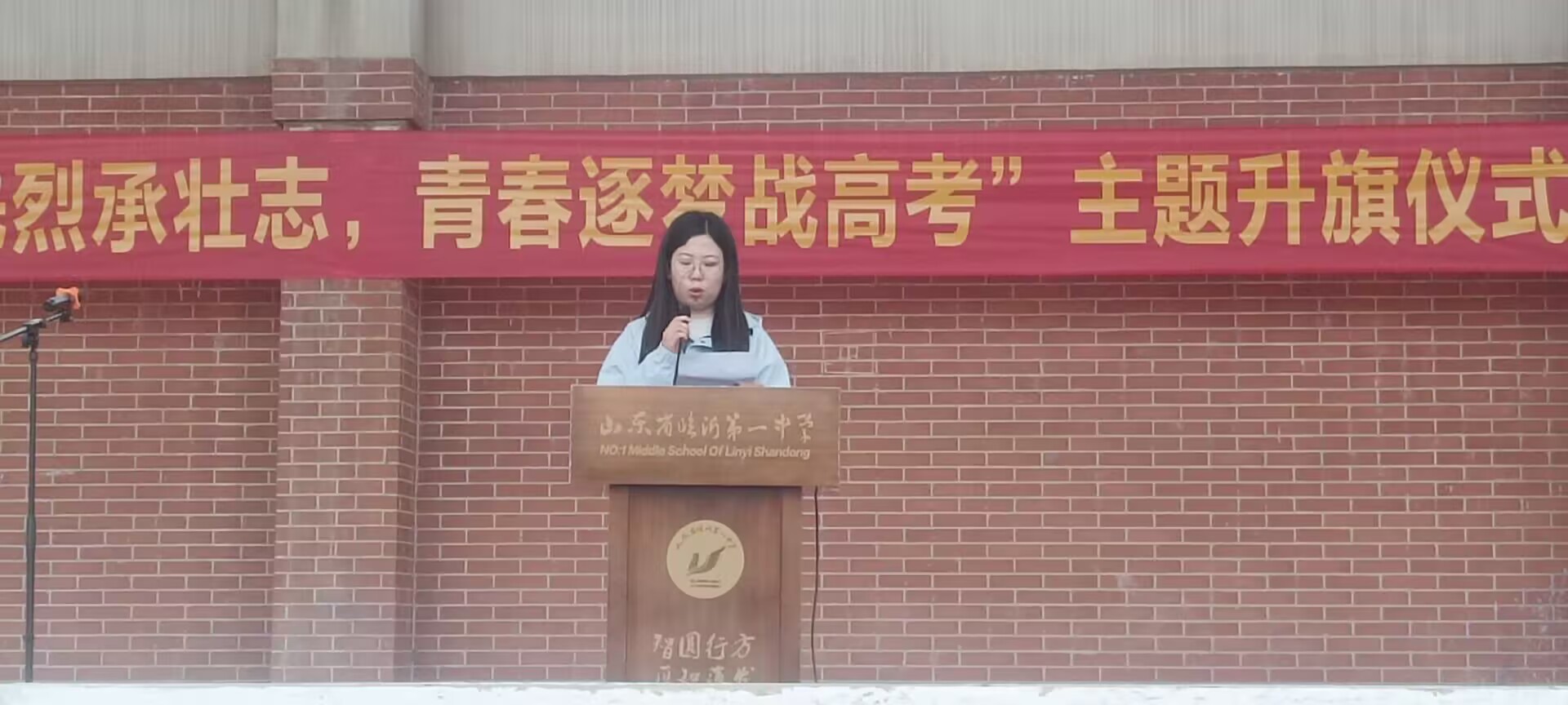 教师代表郭子铭老师在国旗下演讲,她从沂蒙革命老区的红色传统讲起,深情回顾了杨靖宇、赵一曼等革命先烈的事迹,更提到了无数连姓名都未曾留下的年轻战士。“他们牺牲时不过十八九岁,正是和我们高三学子相仿的年纪。”郭老师动情地说,“他们为民族独立、国家富强前赴后继,以生命为炬,照亮了民族前行的道路。他们身上的坚韧与执着,正是我们此刻最应汲取的奋进力量。”