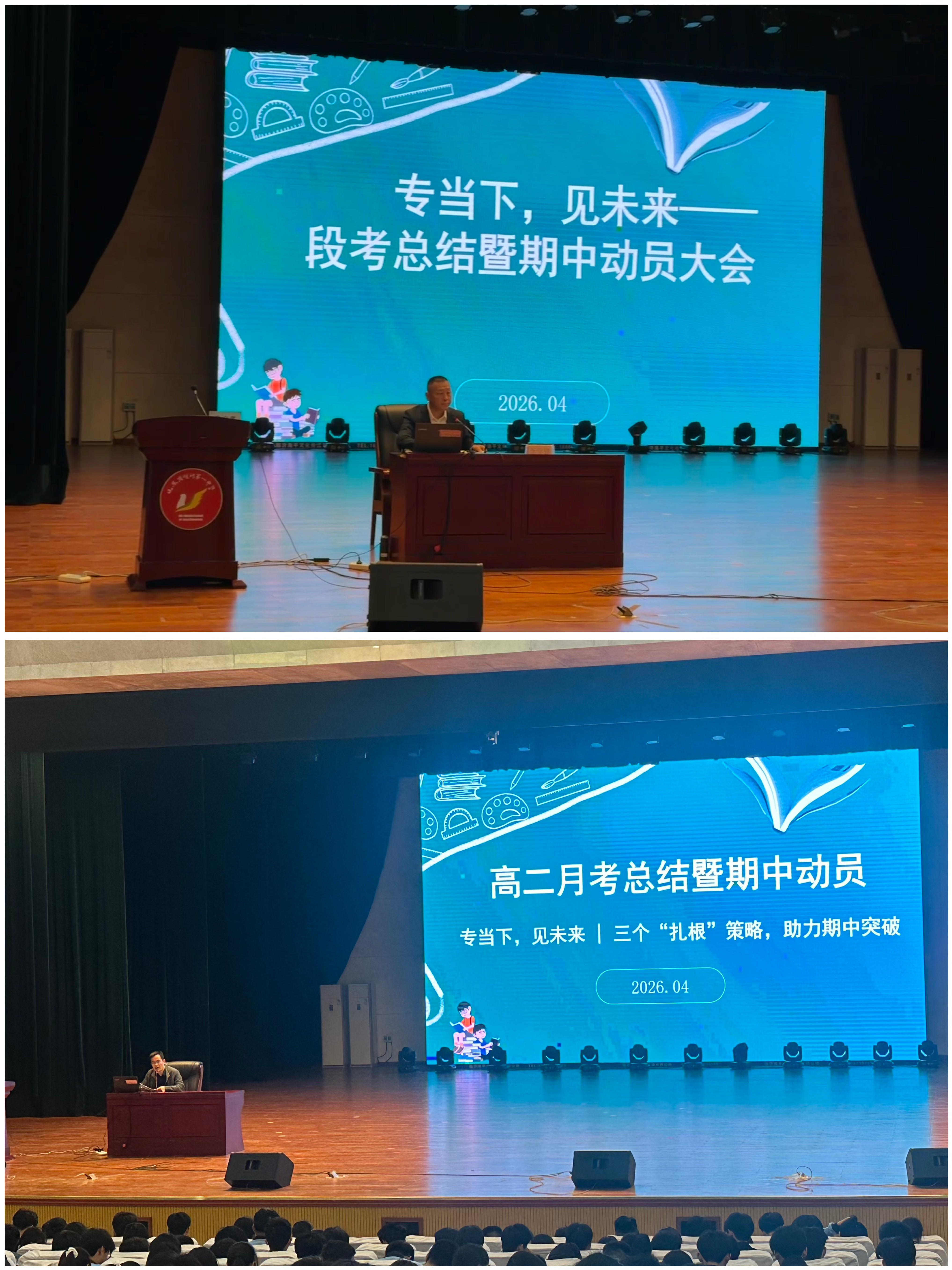 会议第三项,李学建、赵举宝两位主任以“专当下,见未来” 为主题作总结动员。他们着重强调高二下学期承上启下的重要意义,引导学生理性看待考试得失、正视并整改学风问题;从身心状态、知识巩固、自律习惯三个方面提出具体要求,号召全体同学专注当下、踏实复习,以最佳状态冲刺期中考试,为高三的学业进阶积蓄动能。