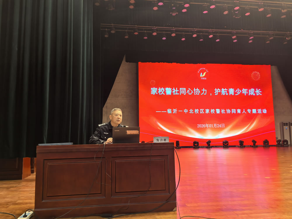 1月24日,临沂一中北校区邀请临沂市公安局交警支队直属三大队副大队长肖树波,柳青派出所所长、临沂一中北校区法制副校长云飞,柳青街道综合执法队队长刘成峰,高一年级二级部家长委员会主任杨宝亮,各班级家委会主任,共同召开“家校警社同心协力,护航青少年成长”专题活动。临沂一中党委副书记、校长朱文宏,副校长、北校区执行校长高翔,全体科室主任、年级主任、班主任参会,各方齐聚一堂,共商育人良策,共护青少年平安成长。