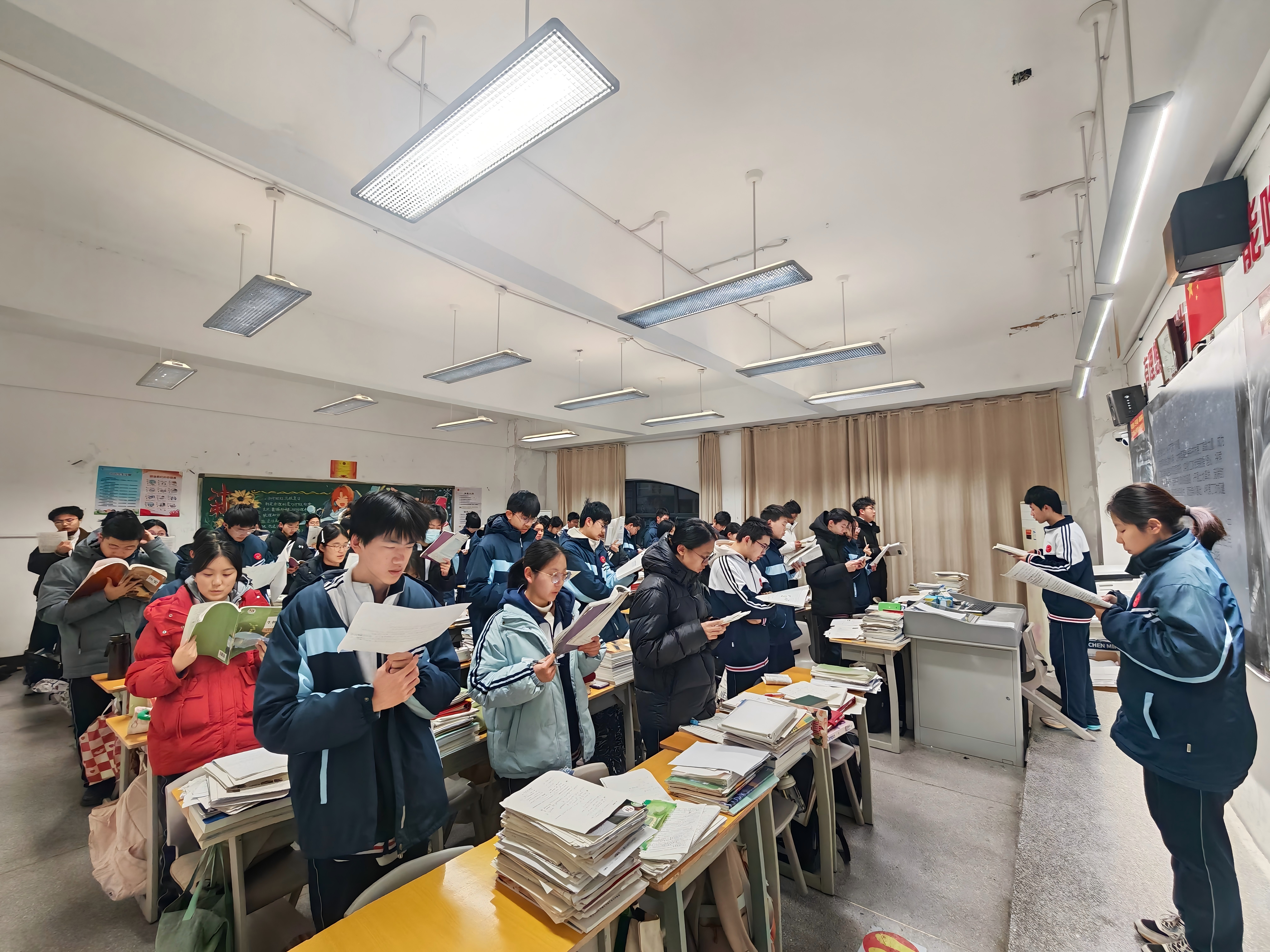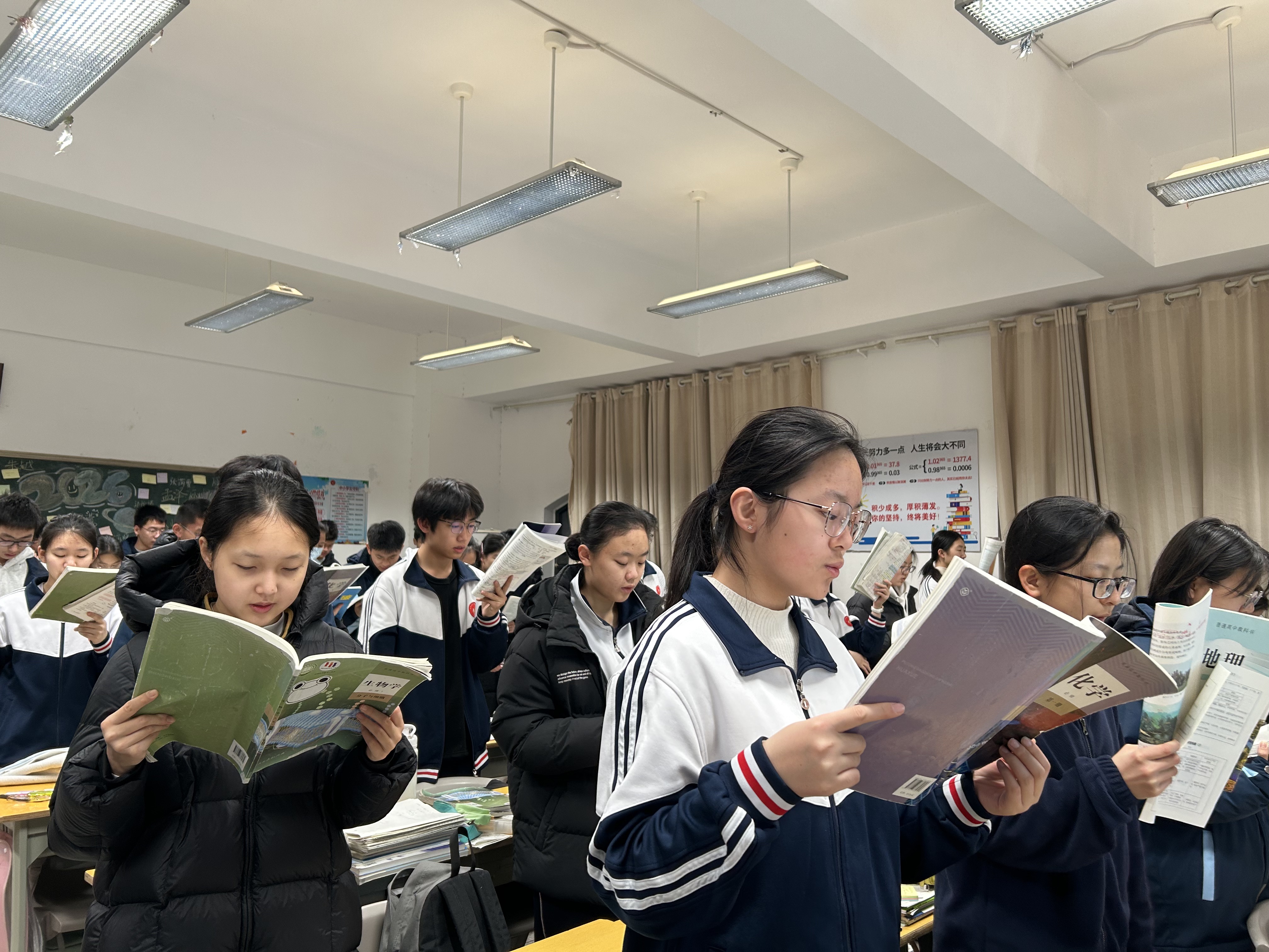 晨光破晓,书香满庭。“站读攻坚”是2025级备考的鲜明特色。同学们挺直脊背、手持书本立于桌旁,有的眉头微蹙,逐字句反复推敲,力求字字入心;有的声音洪亮,将知识点化作声声呐喊;有的边读边记,手指在书页间翩跹,目光专注而坚定。繁杂的知识点、拗口的古诗文、深奥的公式定理,在有力的诵读中被反复打磨、深深镌刻。走廊里,年级领导时而驻足窗边倾听诵读节奏,时而走进教室了解学情;教室中,班主任们或在讲台旁整理考点清单,或走到学生中间纠正知识点偏差……琅琅书声映衬的,是青春最动人的画卷,彰显着“时不我待、只争朝夕”的奋进之志。