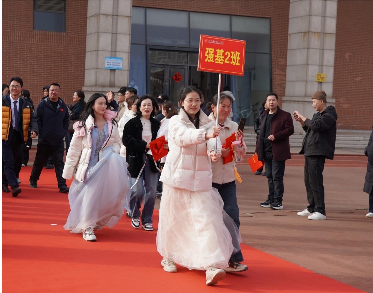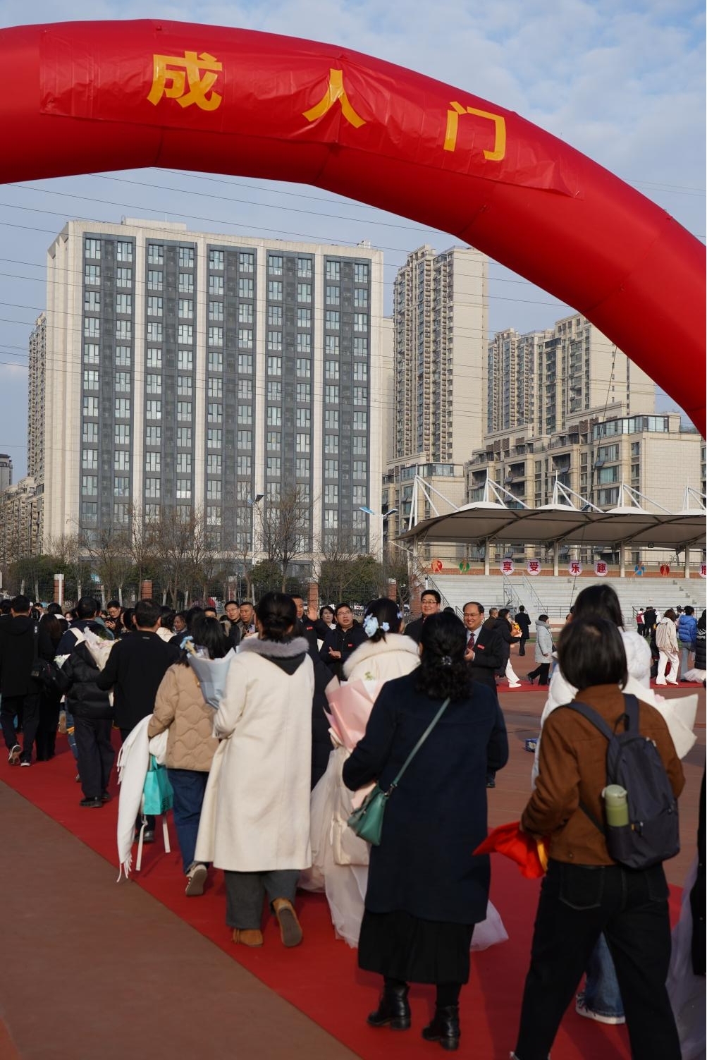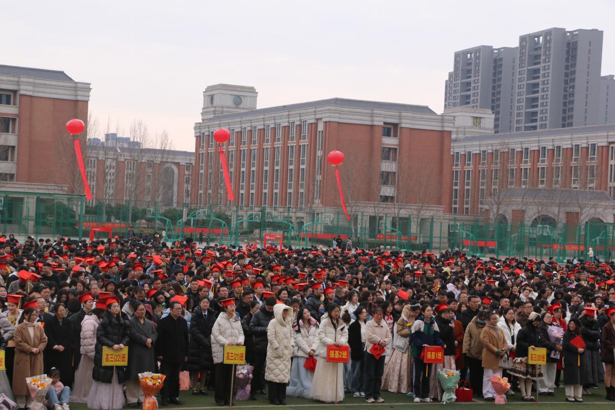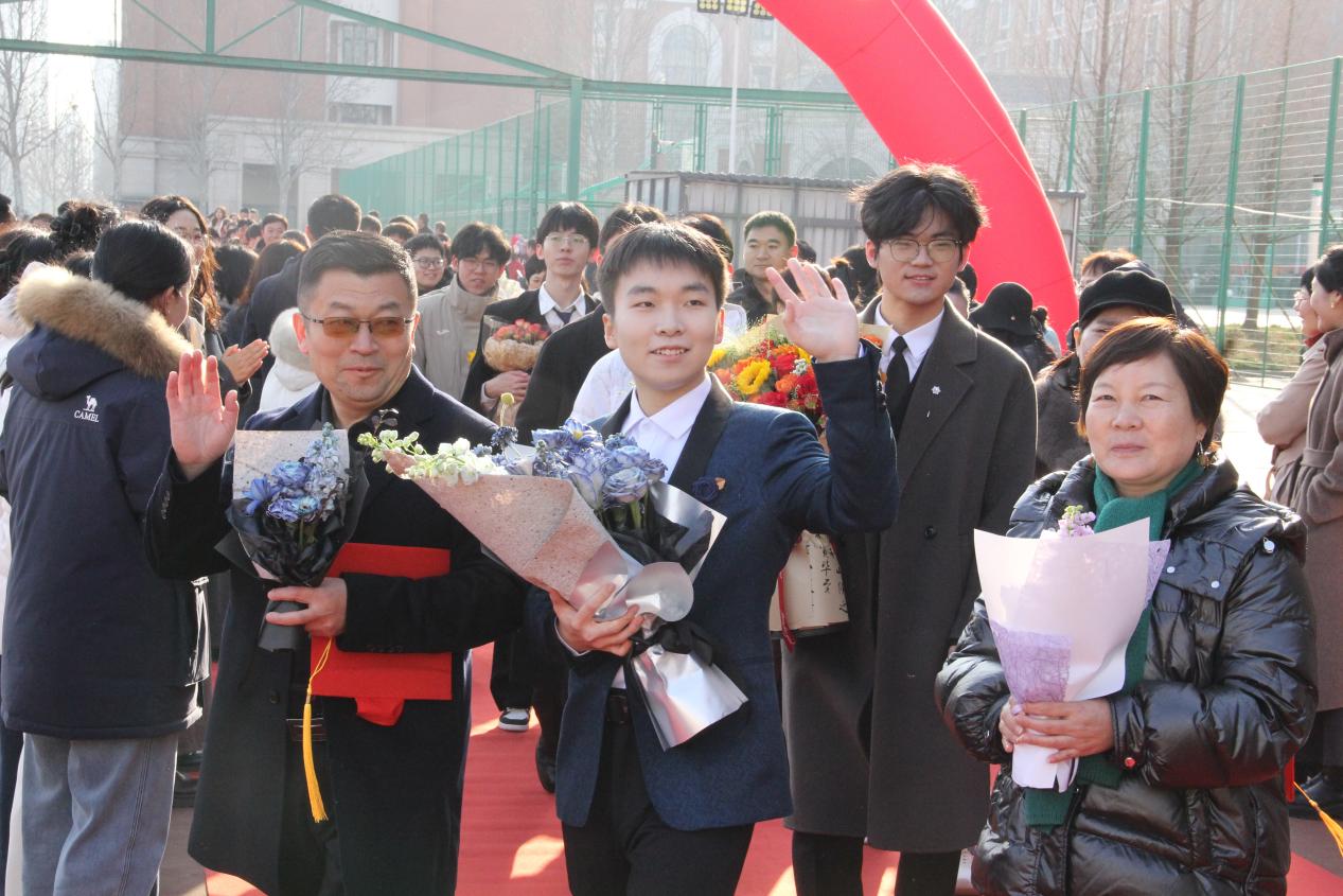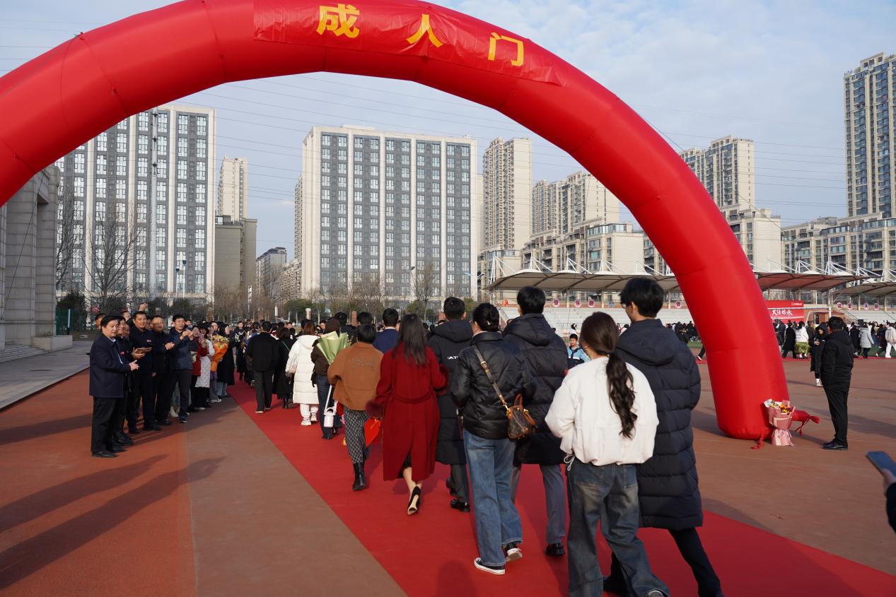 上午8时,悠扬的团歌响彻操场,学子们与父母携手并肩,缓步迈过象征成长与蜕变的“成人门”,学校领导与教师列队两侧送上真挚祝福,红毯之上亲情与期许交织,温馨的瞬间成为学子青春里的珍贵记忆。8时30分,典礼正式启幕,全体肃立奏唱中华人民共和国国歌,雄壮嘹亮的歌声点燃了学子们的家国情怀与责任担当,也让“十八而志 大任始承”的主题信念深植心底。
