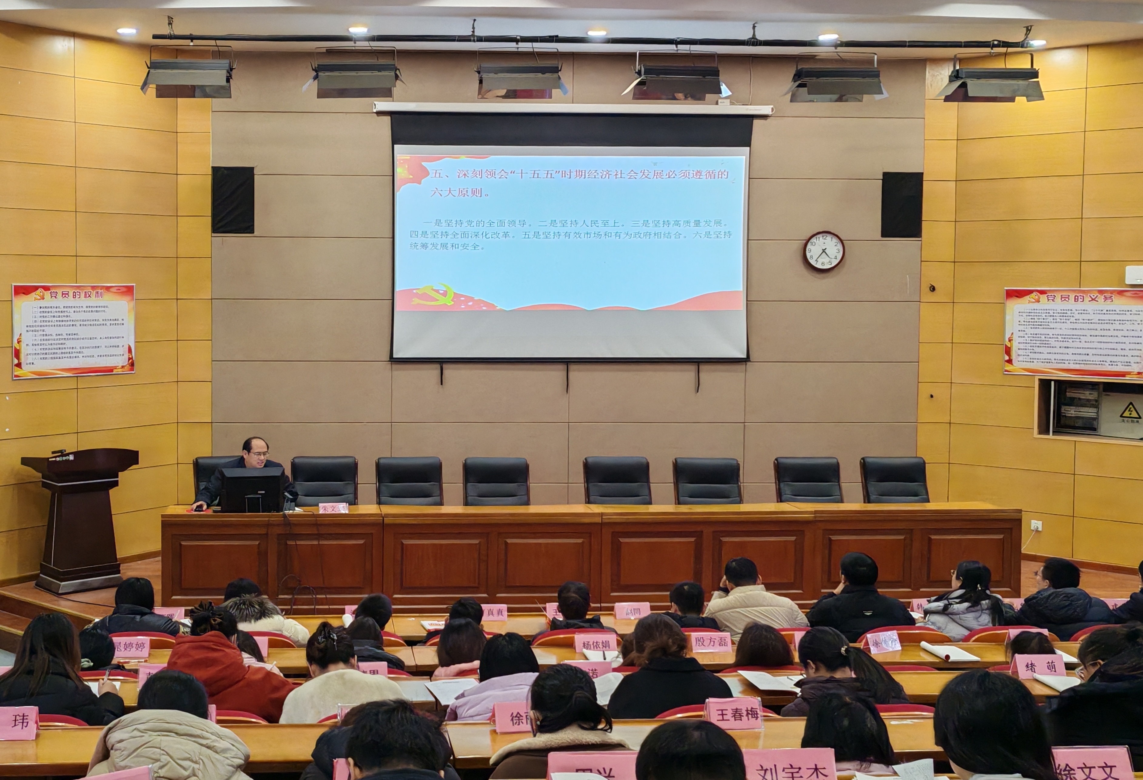 会议第二阶段,朱文宏在党课《我是一名共产党员》中,结合党的二十届四中全会精神、教育教学、学科教研、教学常规、师德师风和学习生活等方面,对全体党员进行全面而深入的指导。全体党员要践行“为党育人,为国育才”初心使命,办人民满意的教育;党员要扎扎实实,朝朝寸进,久久为功,通过做好点点滴滴的本职工作来讲政治;党员以实际行动践行“一名党员,一面旗帜”的要求。
