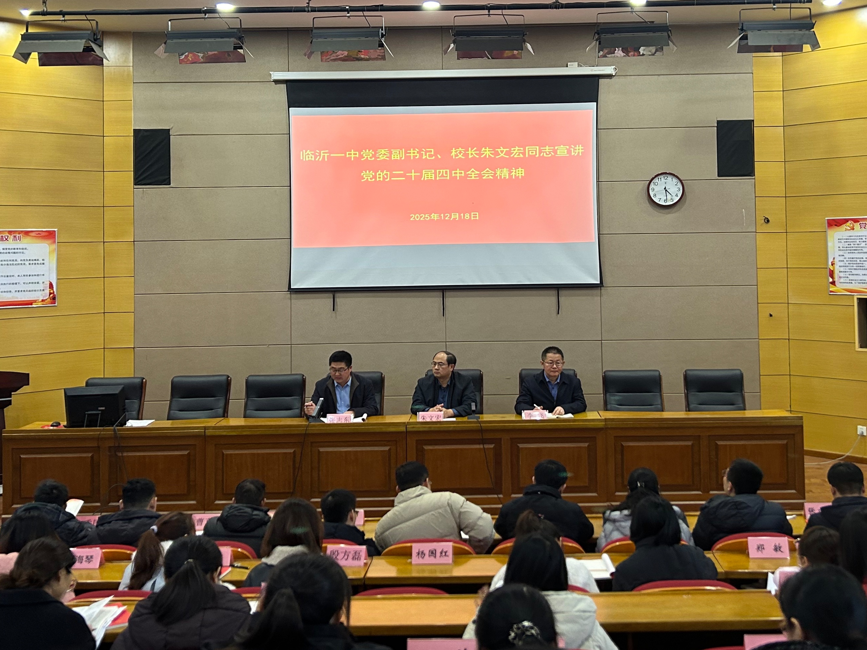 2025年12月18日下午,临沂一中北校区教师第二、第五党支部在党员活动室召开党员大会。临沂一中党委副书记、校长朱文宏参加并宣讲党的二十届四中全会精神和党课《我是一名共产党员》。