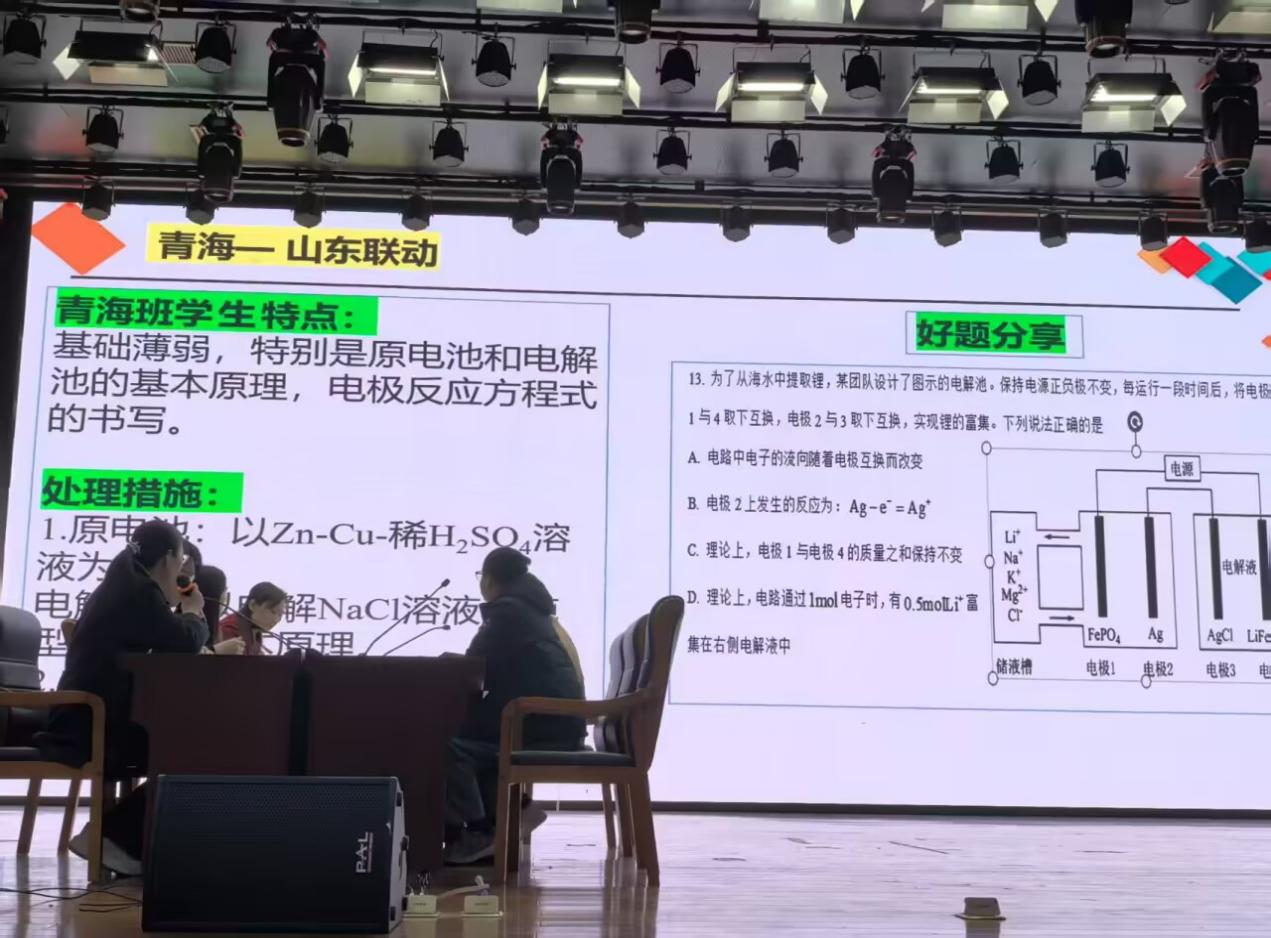 随后,高三化学组进行复习备考专题教研展示。本组以电化学为核心主题,严格按照“反馈学情—聚焦主题—集体攻关—统一进度”四环节推进:精准反馈作业与周练共性错题,系统梳理山东新高考近三年电化学考点;围绕电极判断、电极反应式书写、离子交换膜、电化学计算等构建解题模型,突破浓差电池、有机电极、离子脱嵌型电池等高频难点;针对青海班学生基础薄弱问题,回归基础模型夯实原理;明确任务分工,统一作业、早读、限时训练与知识回扣安排,全力提升高三备考针对性与实效性。