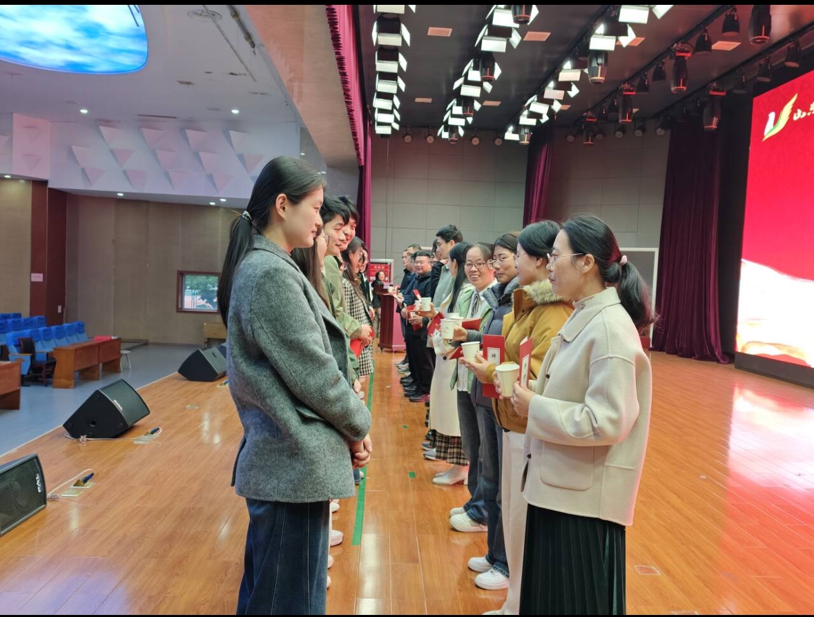 仪式第六项,狄丽烜作“青蓝工程”师徒学习经验分享,并详细解读学校赋分政策,帮助教师明晰评价体系,助力职业规划。
