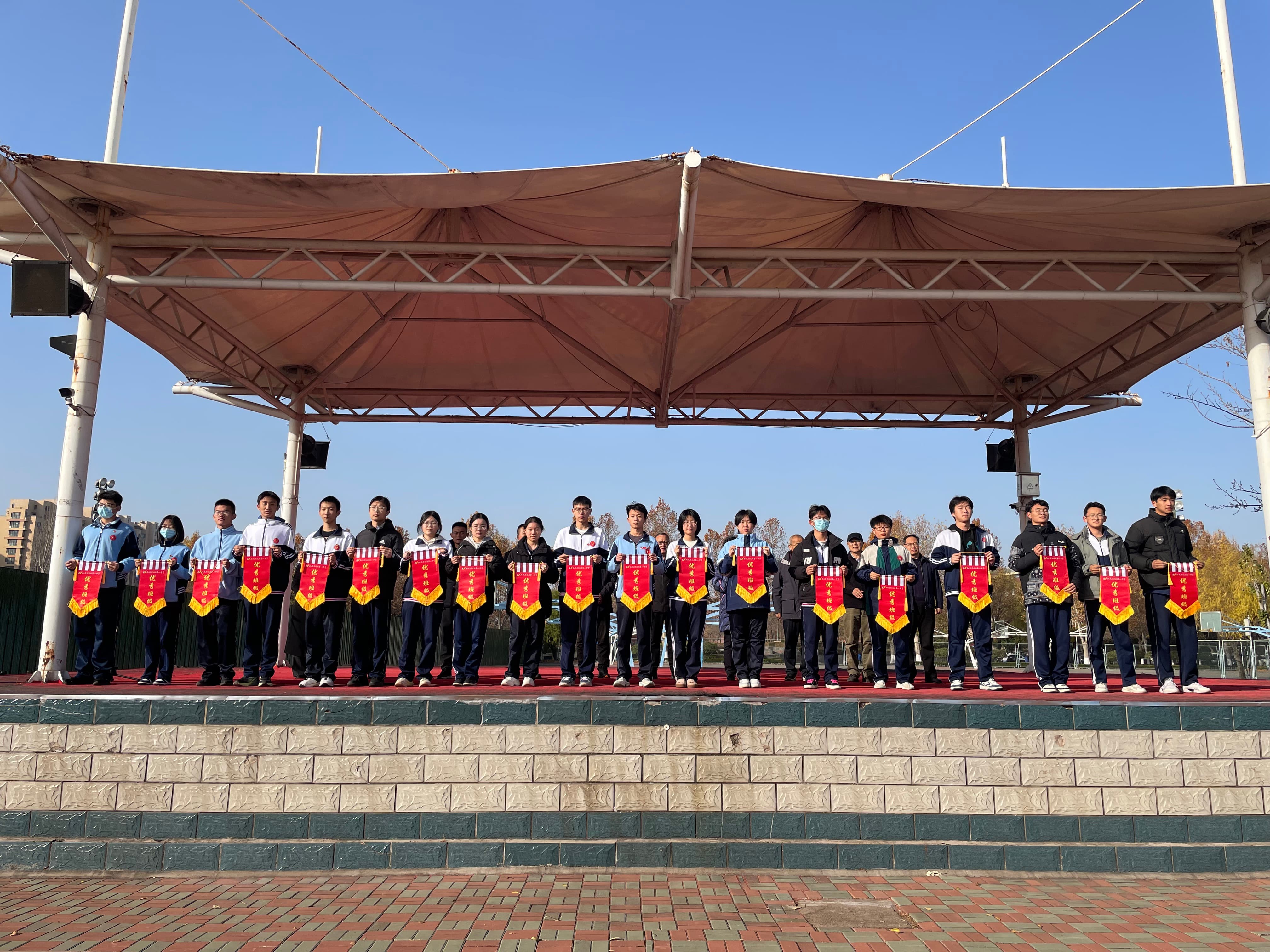 仪式第三项,张嵩主持颁发11月优秀班级流动红旗。