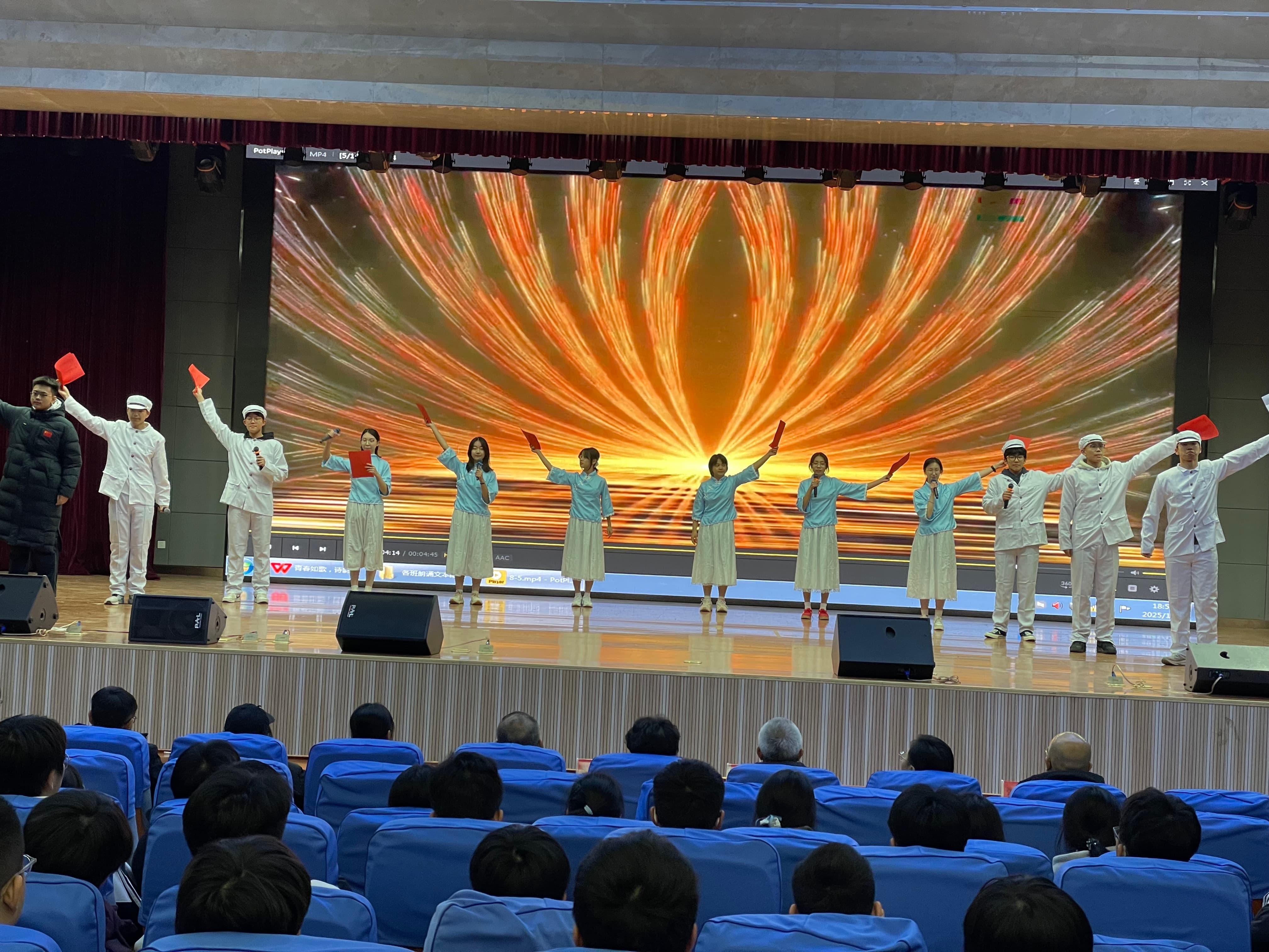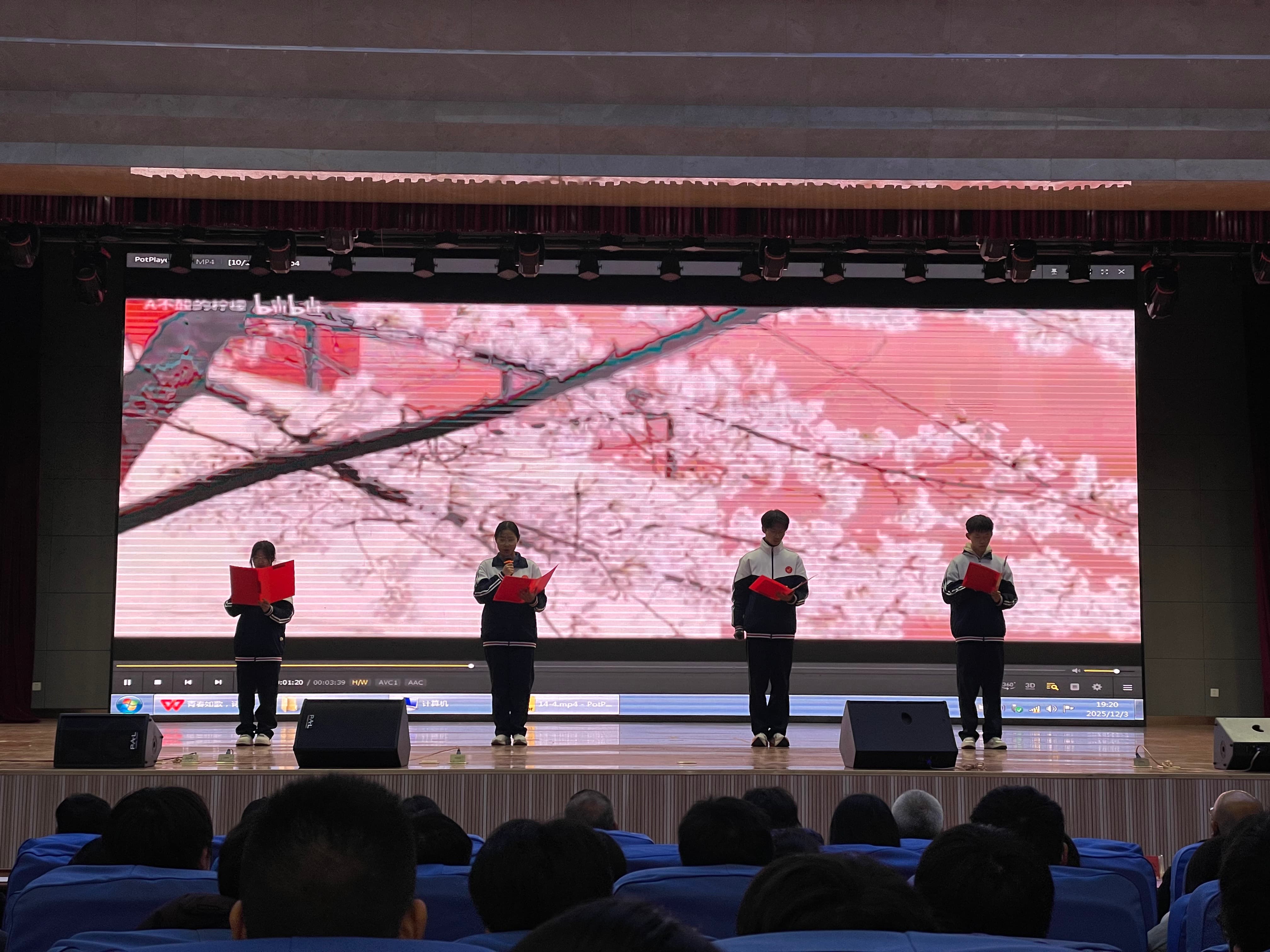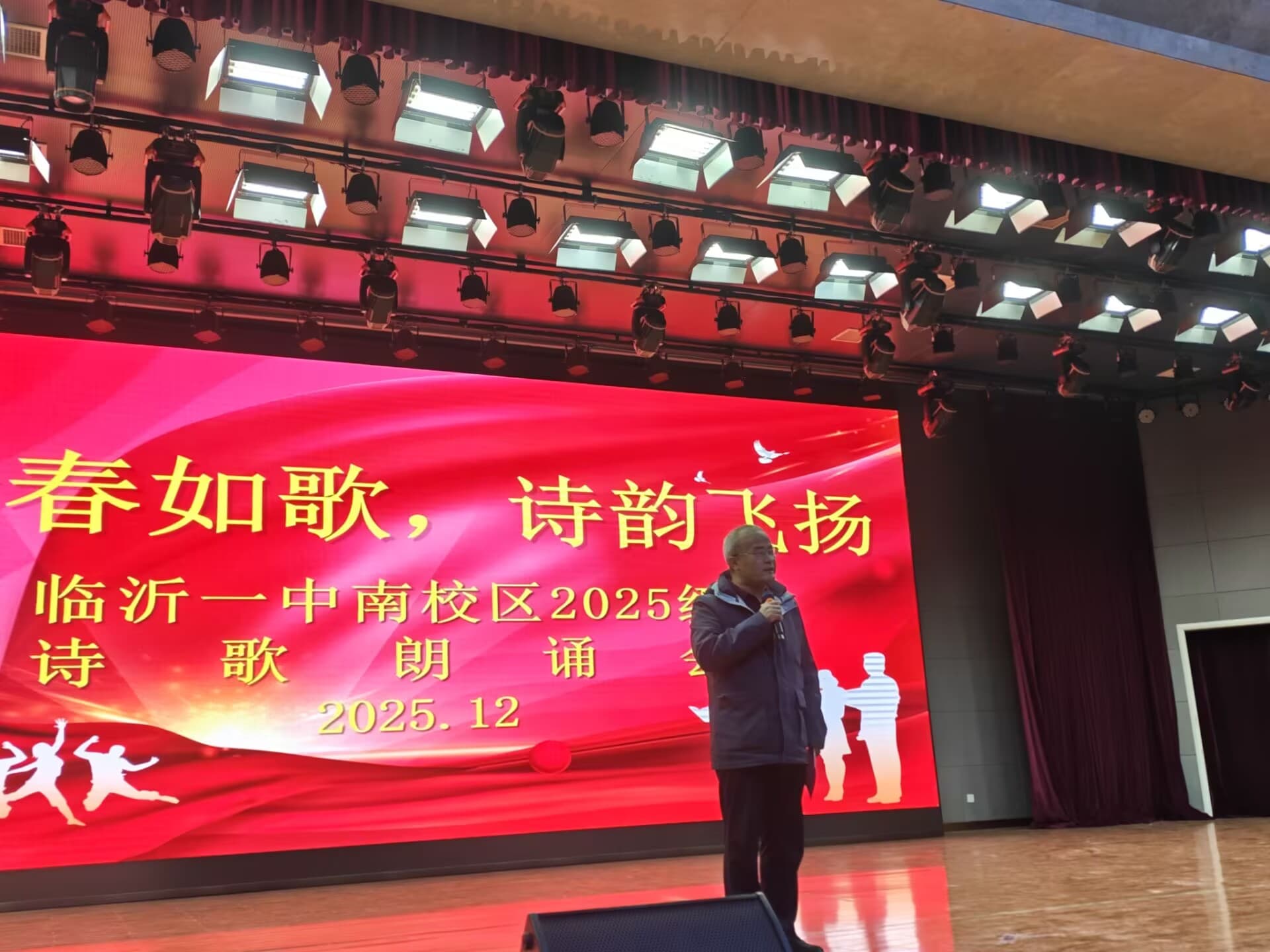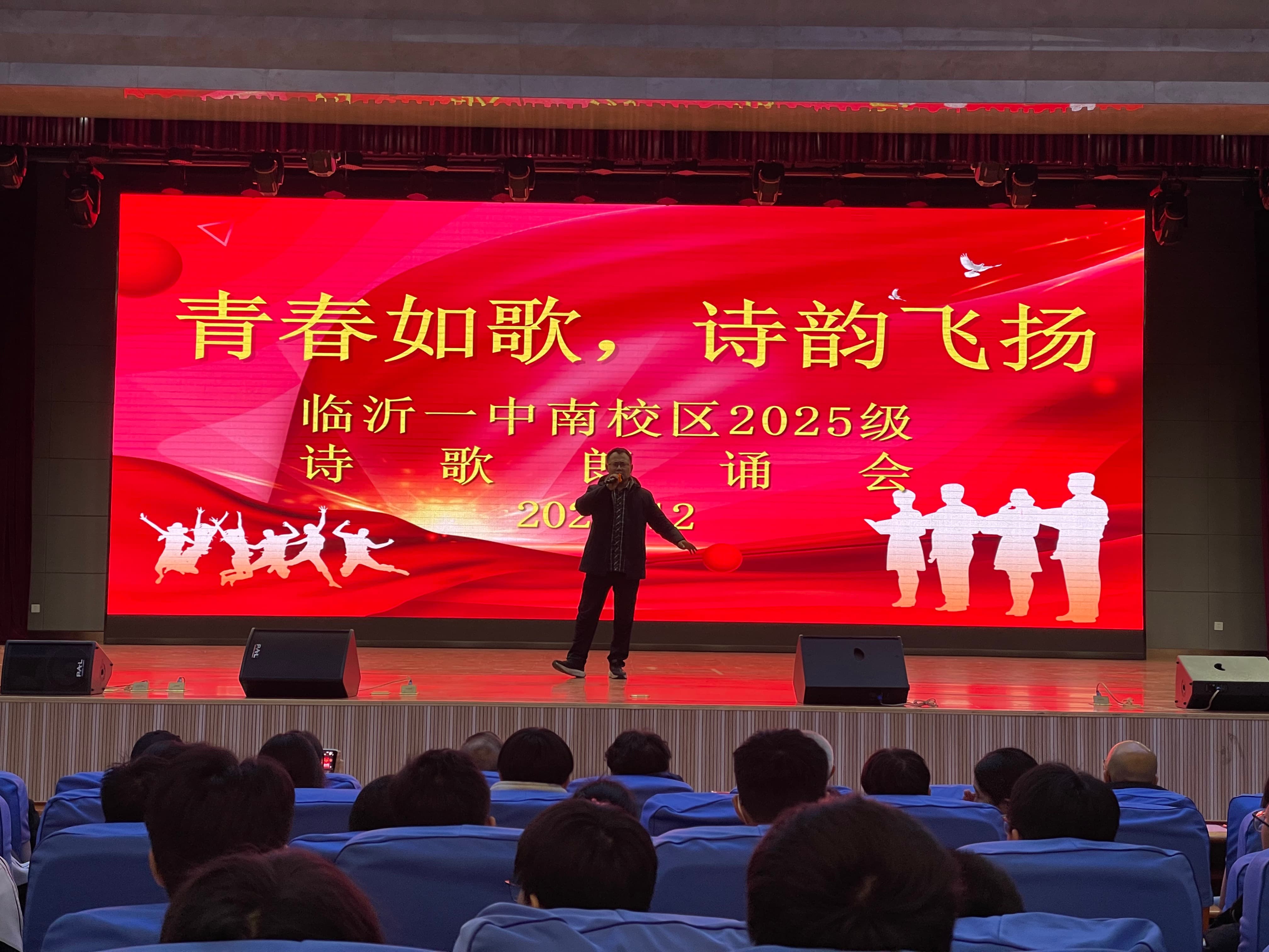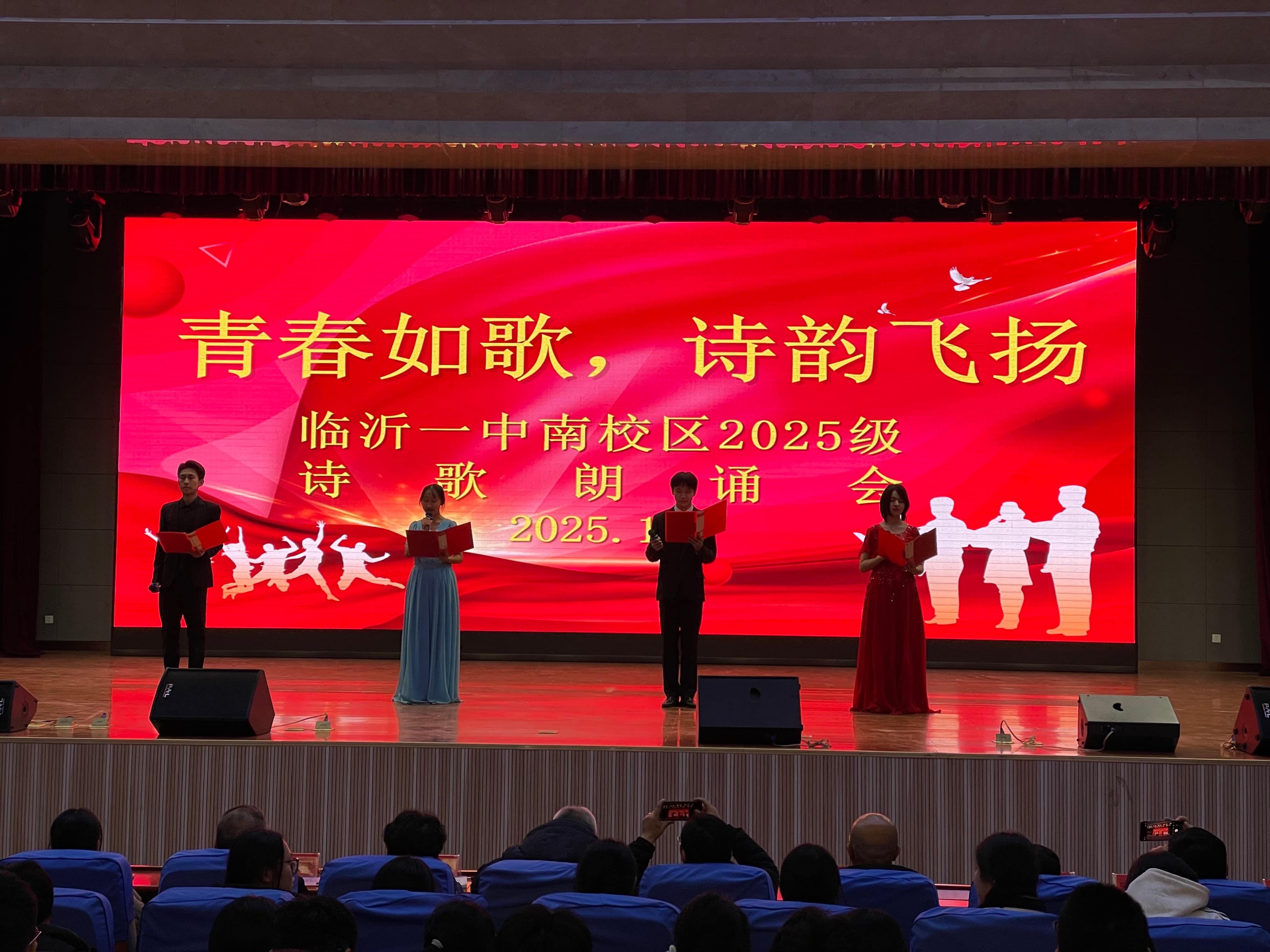 12月4日晚,南校区2025级“青春如歌,诗韵飞扬”诗歌朗诵会在图南大礼堂举行。临沂一中副校长、南校区执行校长宋青,临沂一中副校长薛永杰,南校区校长助理李付前,青海籍带队领导图布腾,国际部主任张广松,高一年级主任刘军,高二年级主任宋昆鹏,高三年级主任李京国,高一年级全体班主任,全体语文老师和学生参加本次活动。