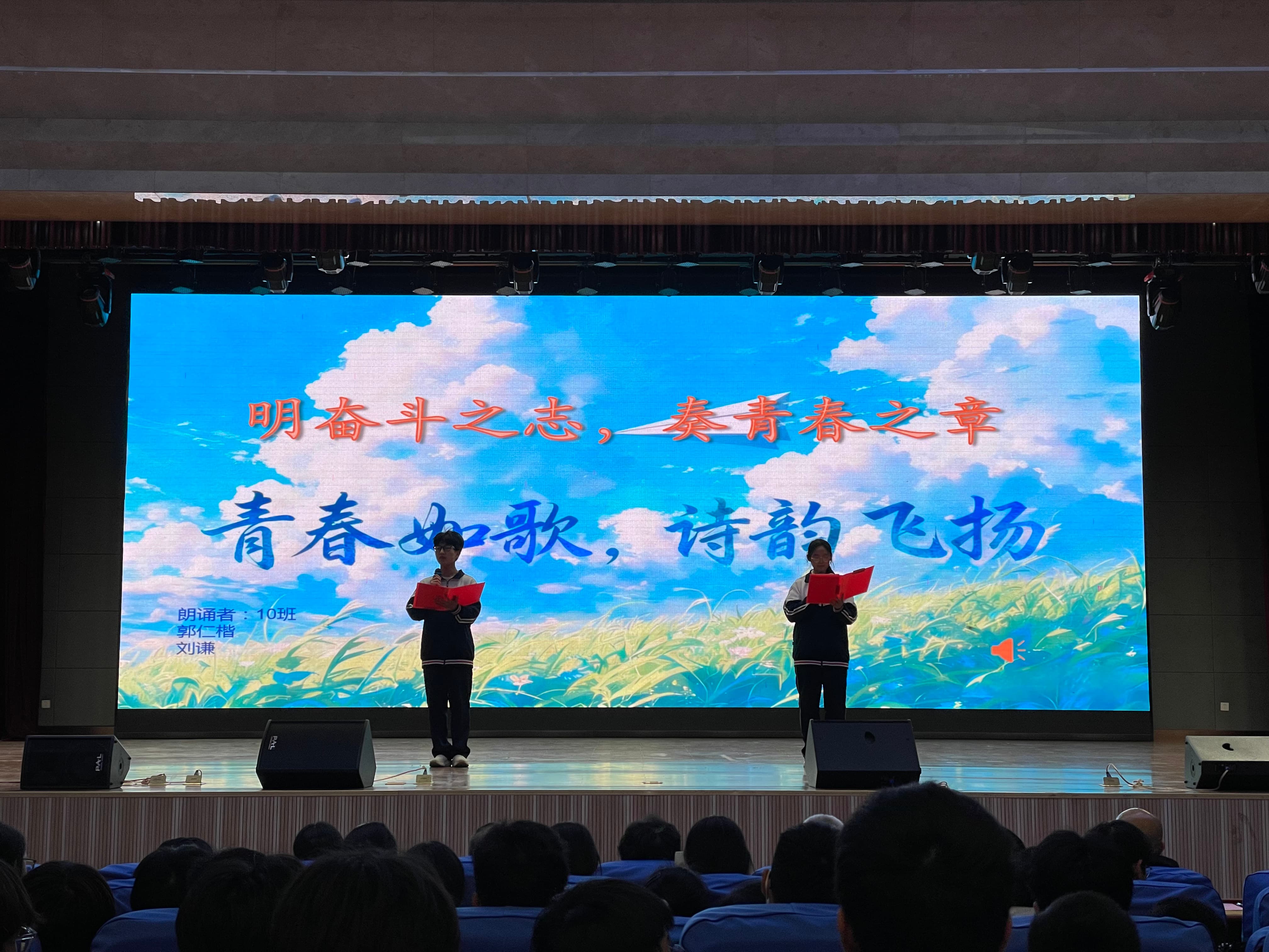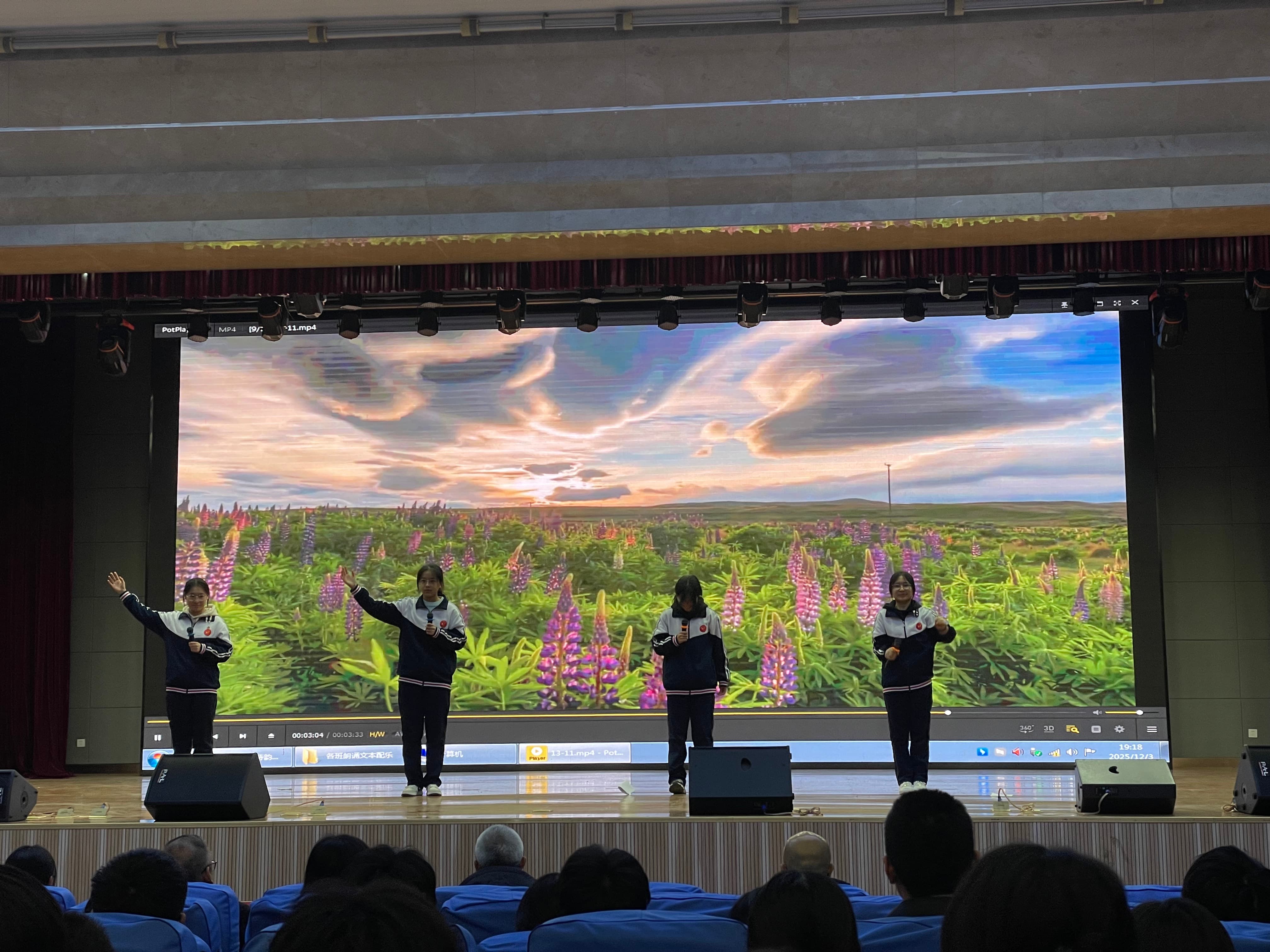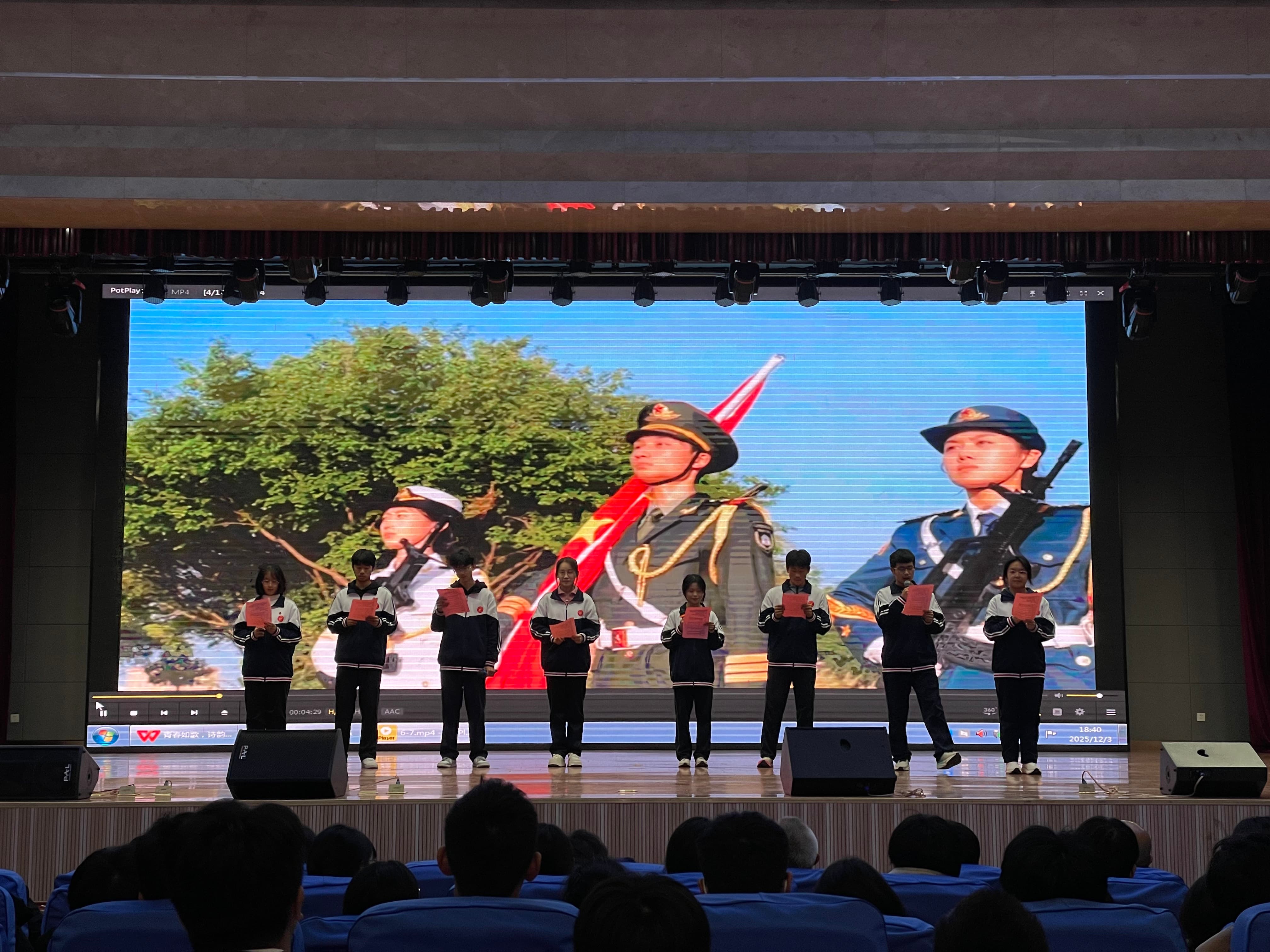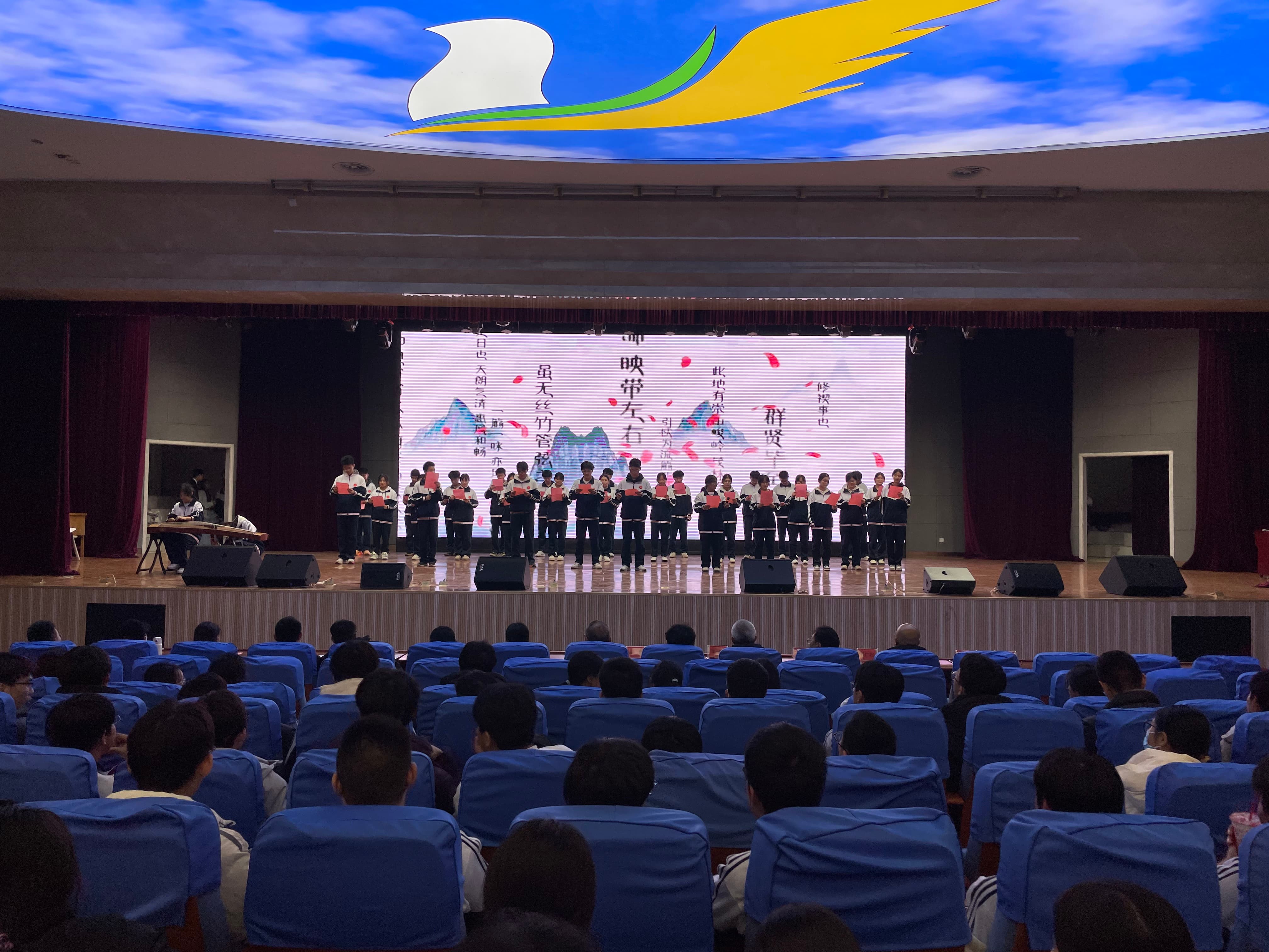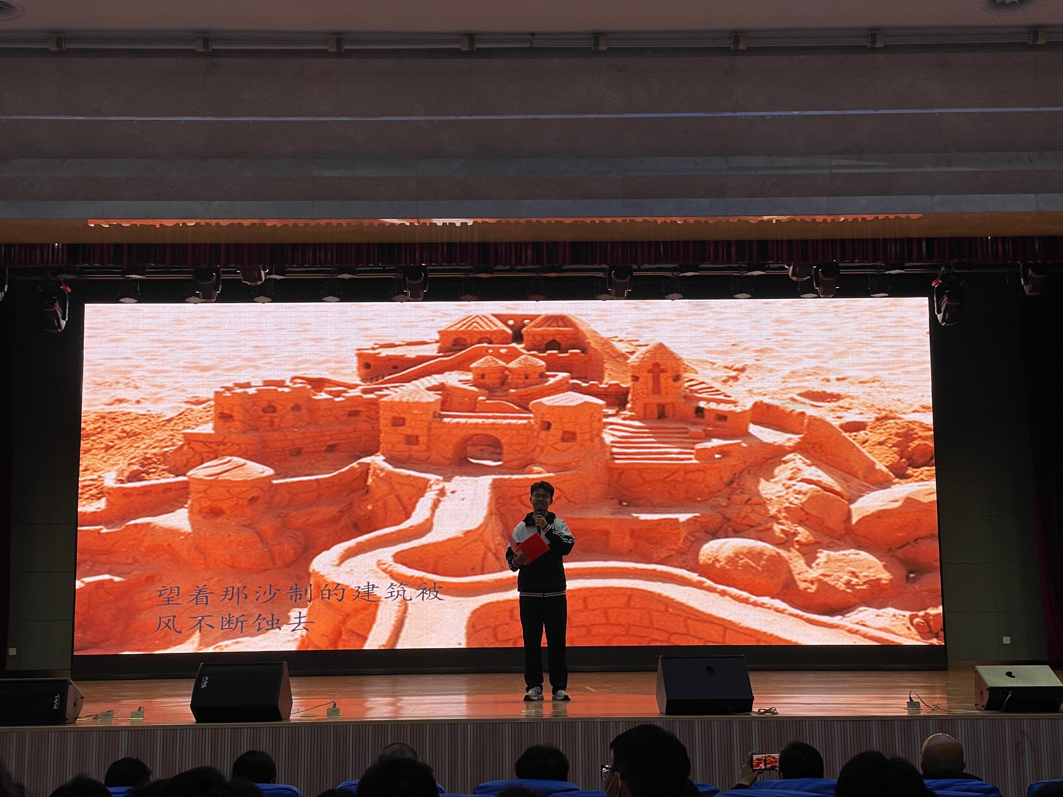 12月4日晚,南校区2025级“青春如歌,诗韵飞扬”诗歌朗诵会在图南大礼堂举行。临沂一中副校长、南校区执行校长宋青,临沂一中副校长薛永杰,南校区校长助理李付前,青海籍带队领导图布腾,国际部主任张广松,高一年级主任刘军,高二年级主任宋昆鹏,高三年级主任李京国,高一年级全体班主任,全体语文老师和学生参加本次活动。