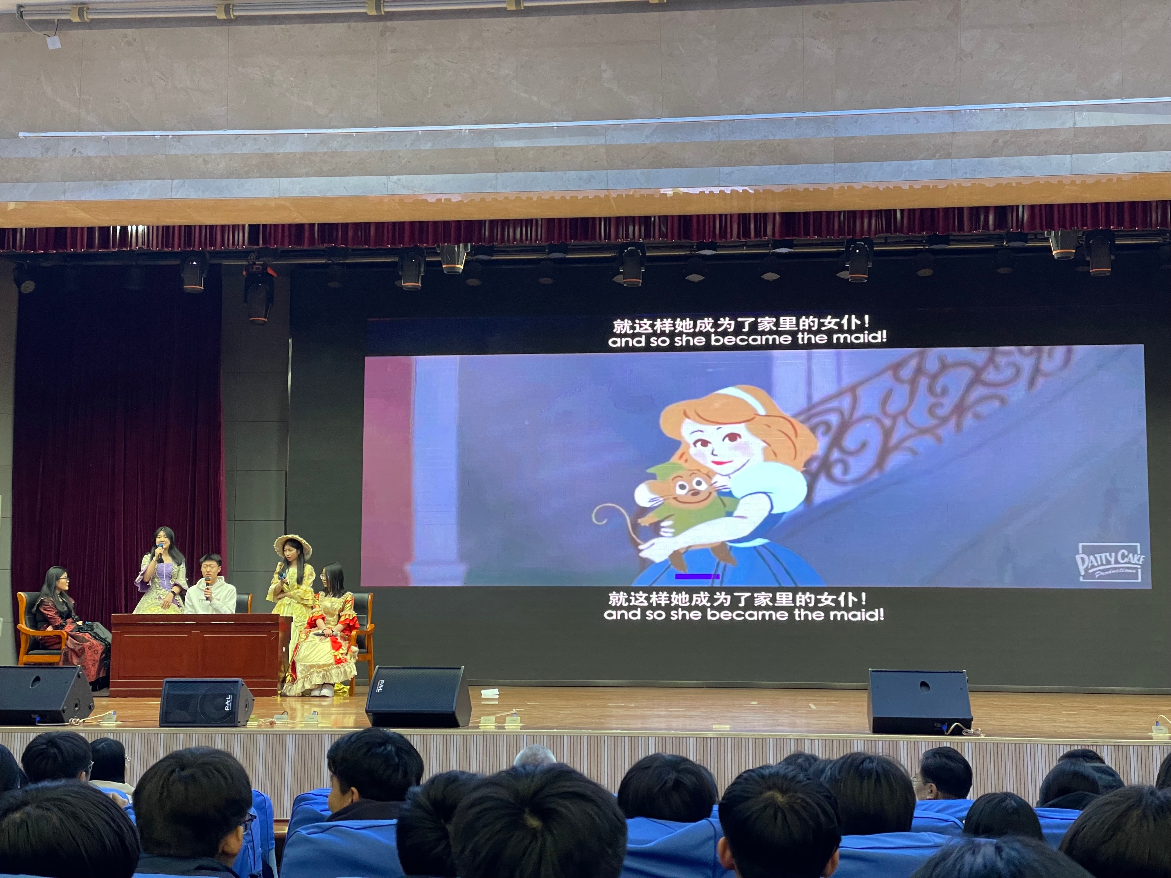 4班同学率先登场,他们带来的是经典童话《灰姑娘》(Cinderella)。在他们生动的演绎中,传递着善良终将战胜邪恶的信念,演绎了一场梦想与现实的华丽蜕变。